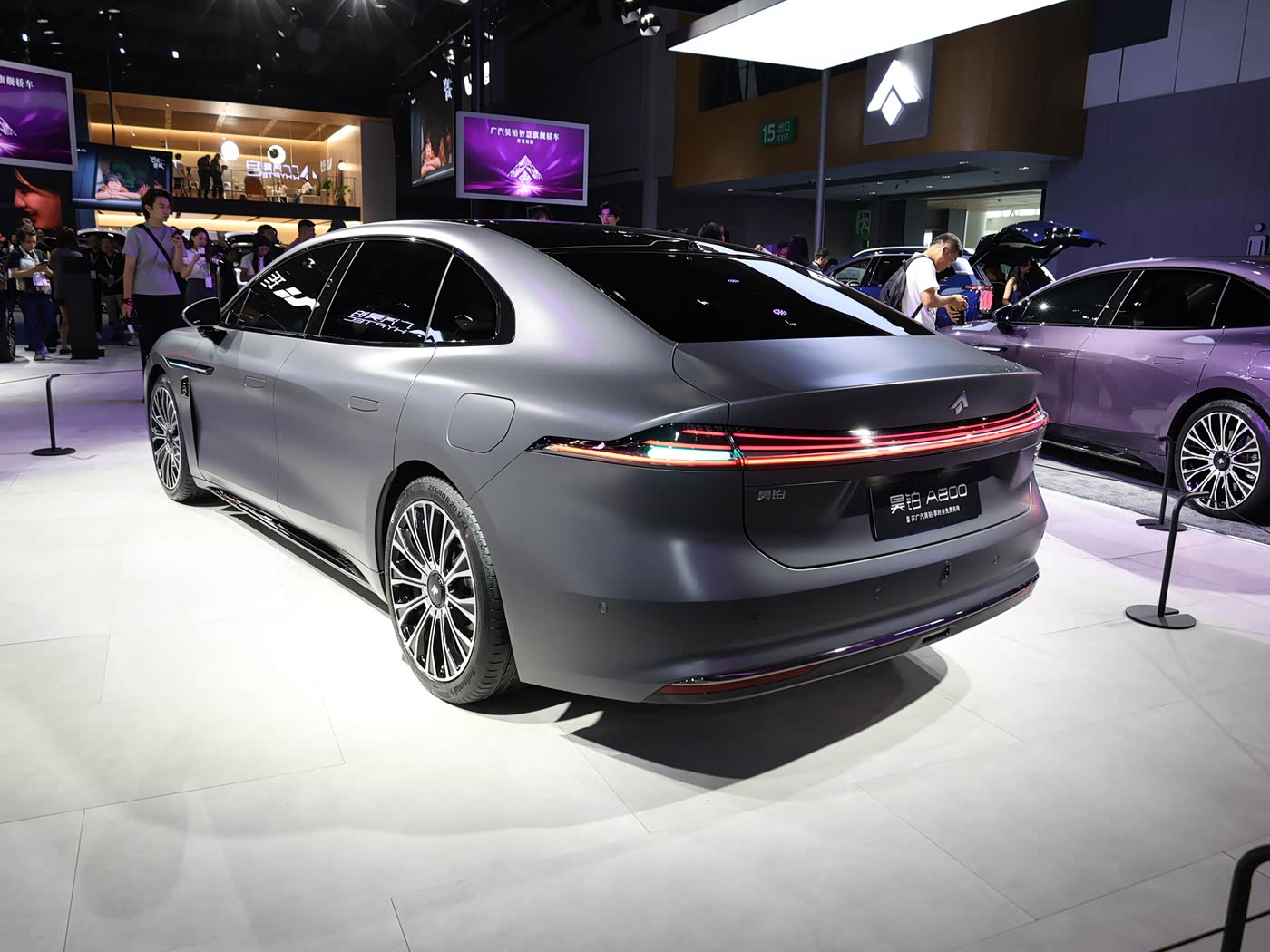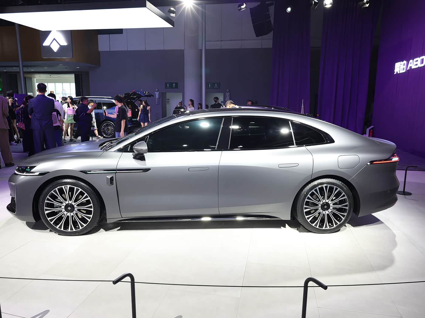 再来看车身侧面部分,车身尺寸为5130×1966×1492毫米,轴距达3020毫米,通过3.2倍黄金轮轴比打造修长舒展的比例。新车采用溜背化设计,前低后高的姿态营造出“贴地飞行”的动感,风阻系数控制在较低水平,兼顾美学与空气动力学。隐藏式门把手与流畅的侧身线条进一步强化了整体感,车身长度较前代昊铂GT有所增加,为车内空间奠定基础。专属“星云紫”车漆在不同光线下呈现深紫至淡蓝的渐变效果,低调中透出奢华气质。